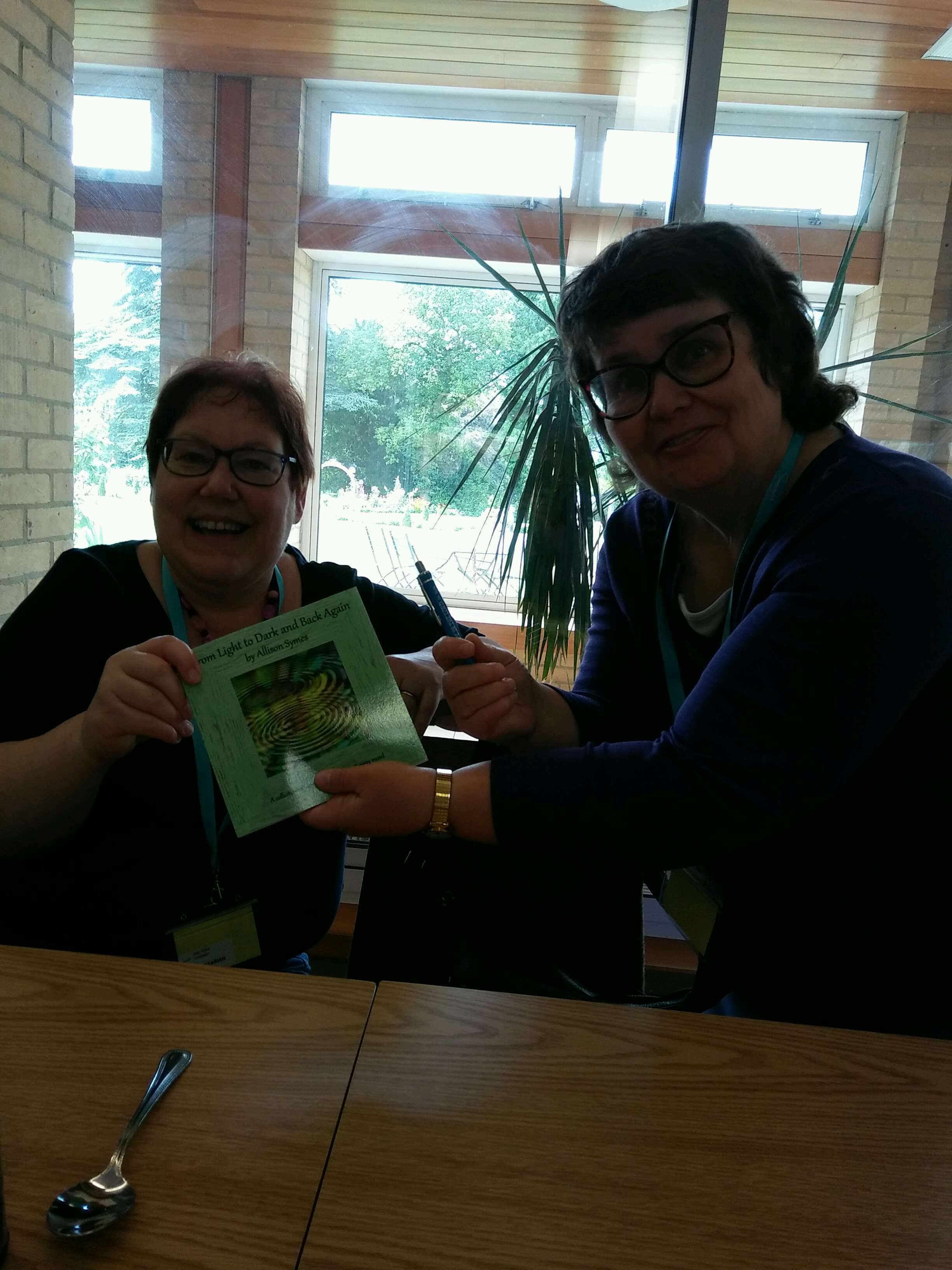 Val Penny and I networking (!) at Swanwick in 2017. Here I’ve just signed my book for Val. At Swanwick in 2018 I plan to ask Val to sign her book for me! Image taken by Jennifer C Wilson.