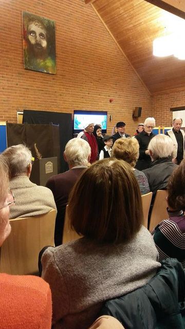 Mike and cast – note the changed Scrooge in his Christmas waistcoat to the right