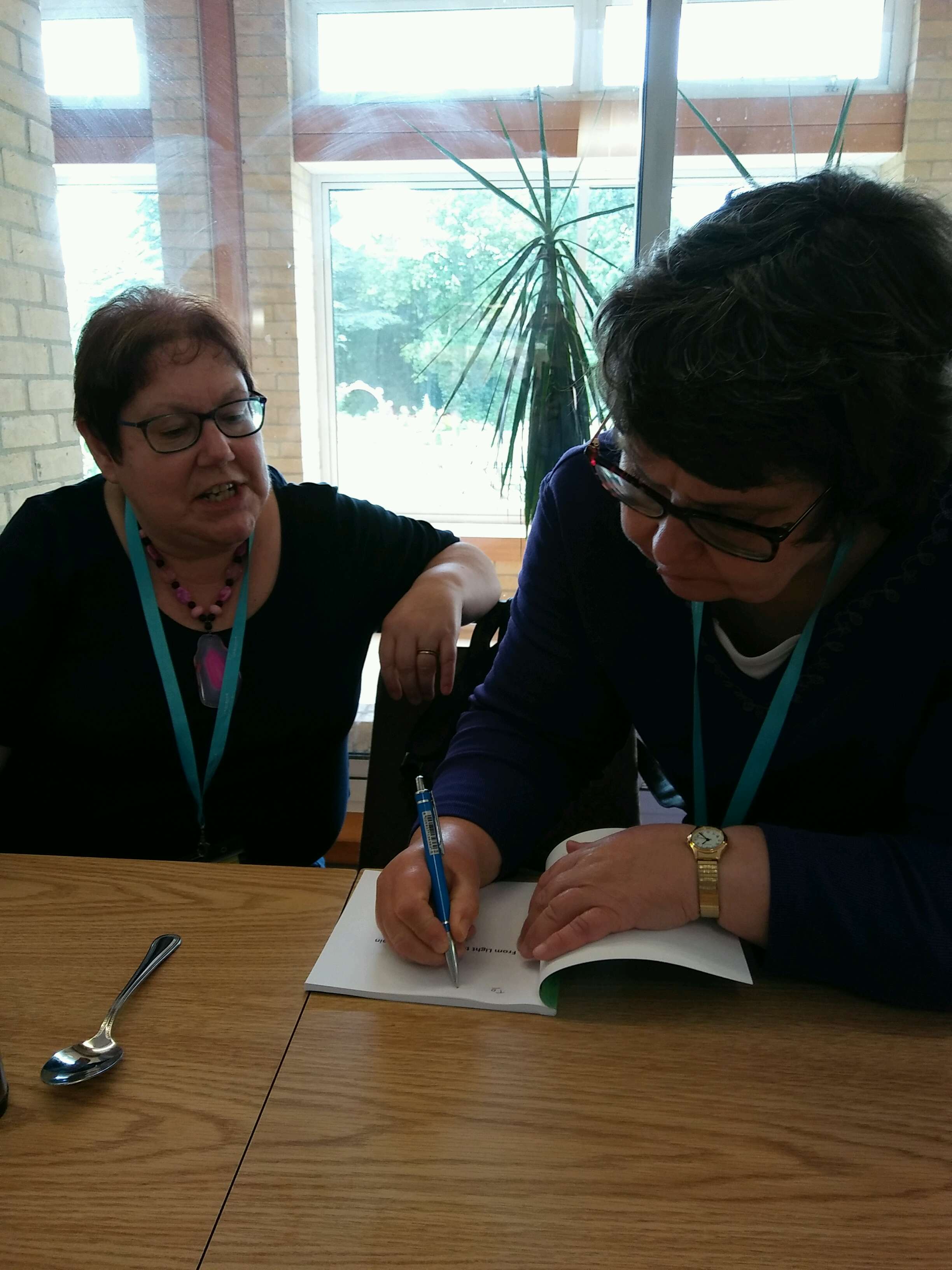 Finding out how Val wants the book signed Previous Published October 16, 2020 at 2448 × 3264 in THE PHONE CONVERSATION Val and I at Swanwick Writers’ Summer School.