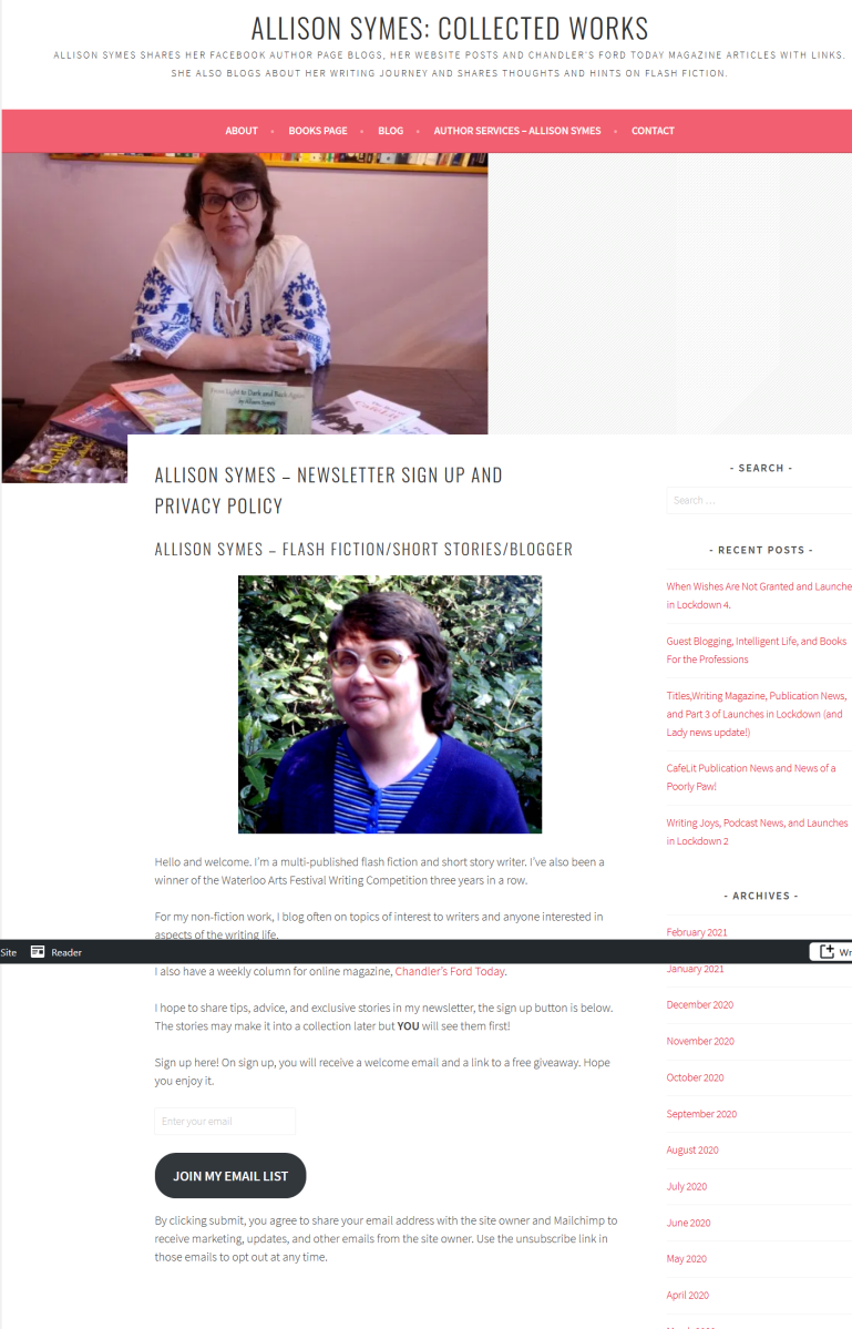 Allison Symes shares her Facebook author page blogs, her website posts and Chandler's Ford Today magazine articles with links. She also blogs about her writing journey and shares thoughts and hints on flash fiction.