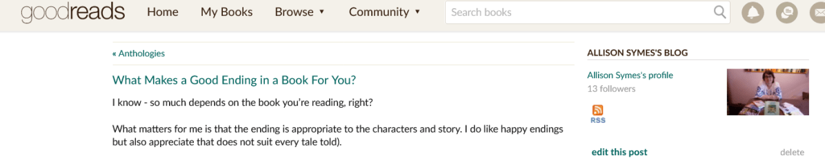 Allison Symes shares her Facebook author page blogs, her website posts and Chandler's Ford Today magazine articles with links. She also blogs about her writing journey and shares thoughts and hints on flash fiction.