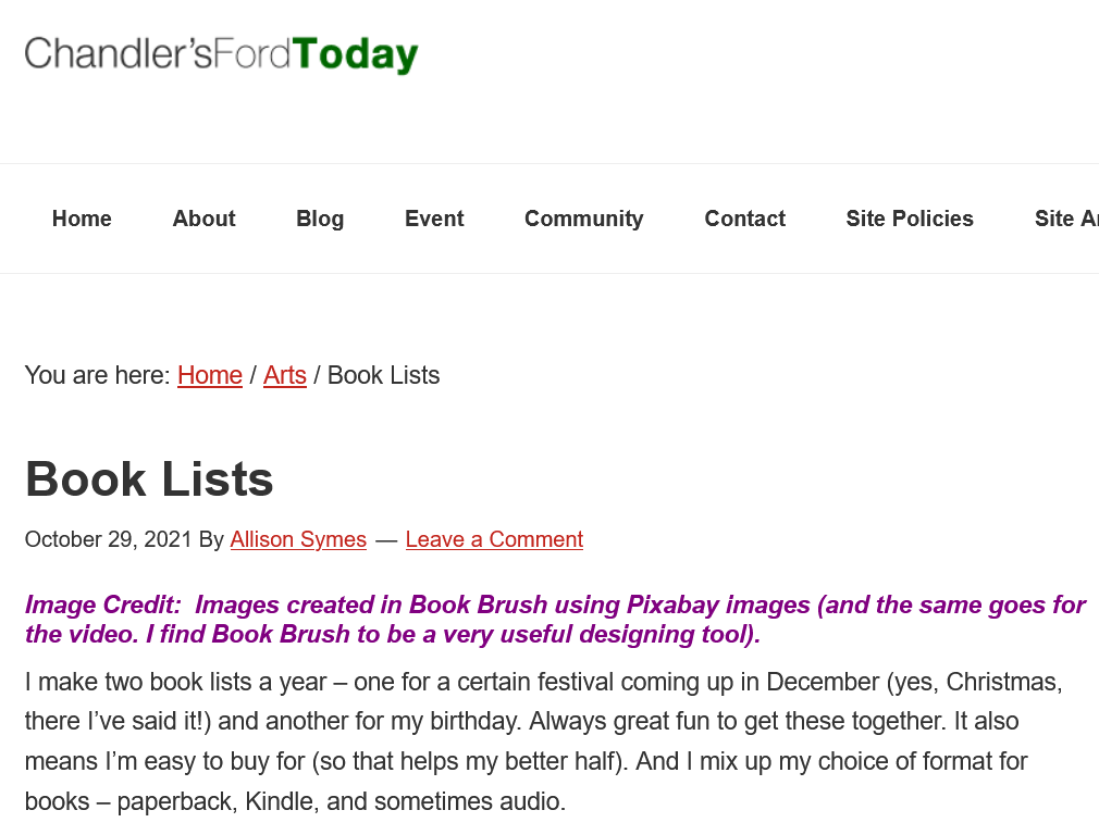 Allison Symes shares her Facebook author page blogs, her website posts and Chandler's Ford Today magazine articles with links. She also blogs about her writing journey and shares thoughts and hints on flash fiction.