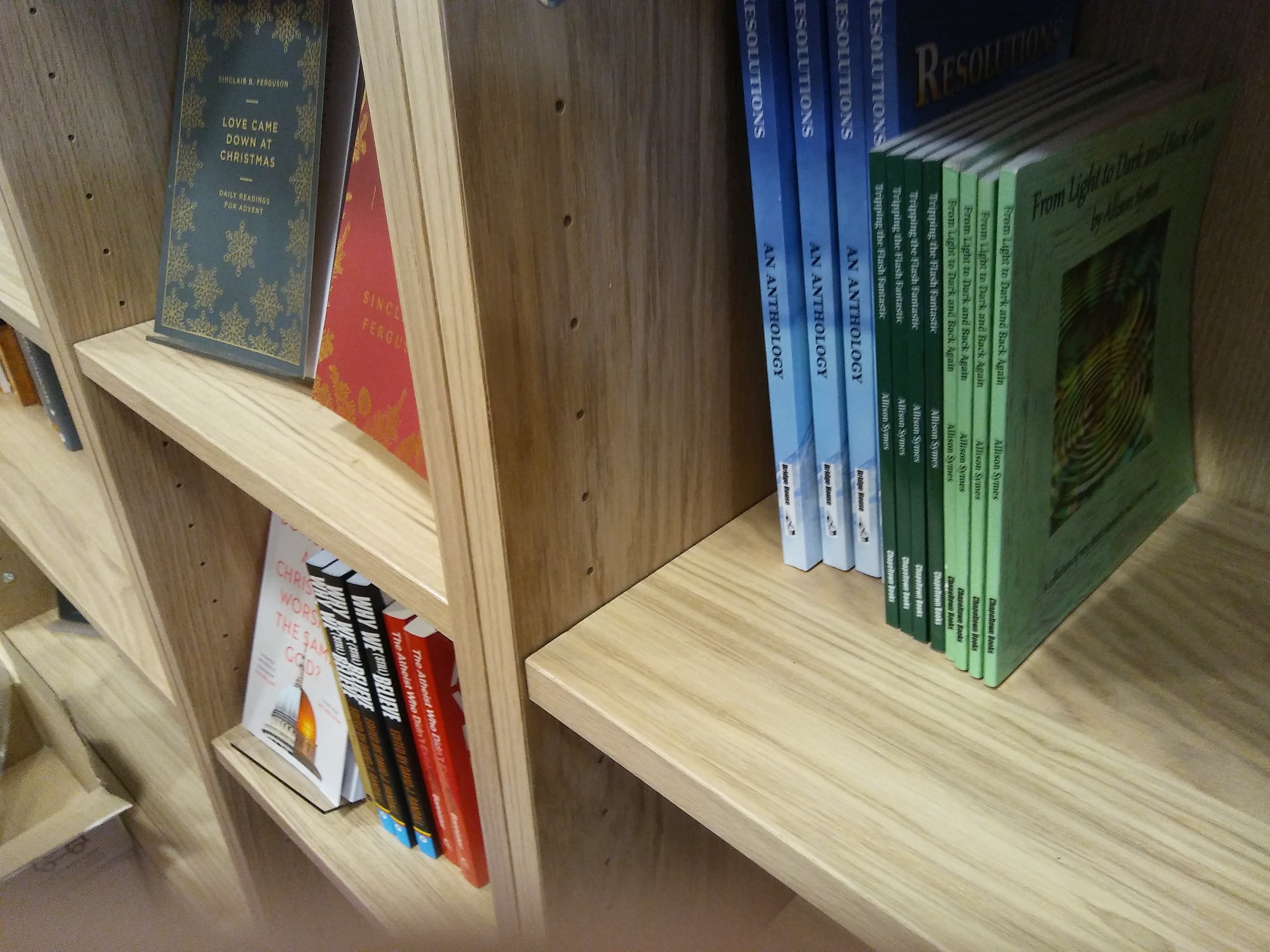My books at the Barnabas Bookshop including Resolutions, the latest Bridge House anthology where I have a short story