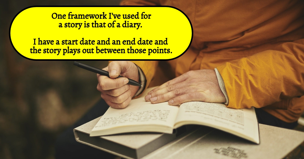 I’ve used the diary format as a framework Previous Next Published February 18, 2022 at 1200 × 628 in In Fiction – Frameworks and Animals – and A Good Cause