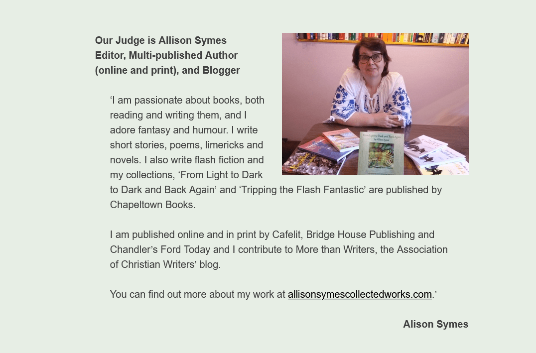 Allison Symes shares her Facebook author page blogs, her website posts and Chandler's Ford Today magazine articles with links. She also blogs about her writing journey and shares thoughts and hints on flash fiction.