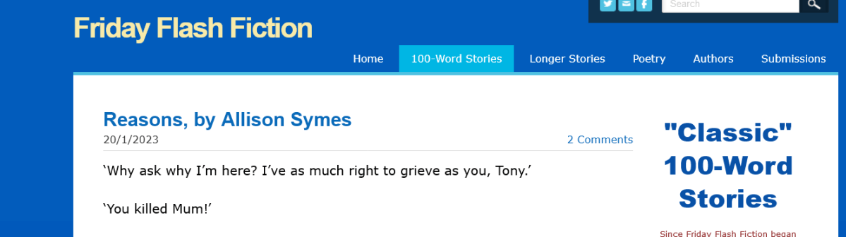 Allison Symes shares her Facebook author page blogs, her website posts and Chandler's Ford Today magazine articles with links. She also blogs about her writing journey and shares thoughts and hints on flash fiction.