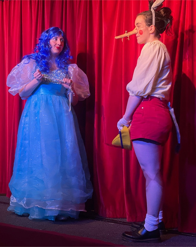 Fairy Powderpuff gives Pinocchio a second chance – the donkey ears and long nose disappear behind the curtain