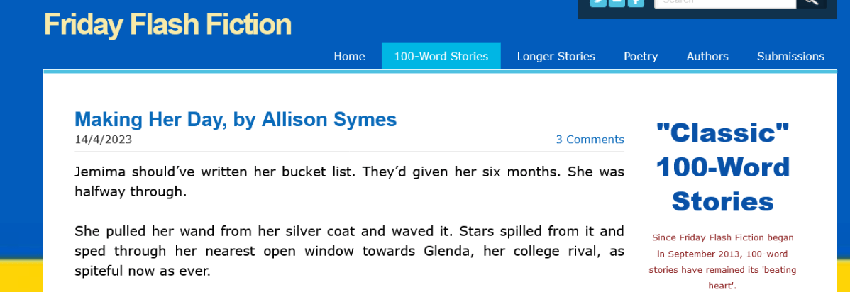 Allison Symes shares her Facebook author page blogs, her website posts and Chandler's Ford Today magazine articles with links. She also blogs about her writing journey and shares thoughts and hints on flash fiction.