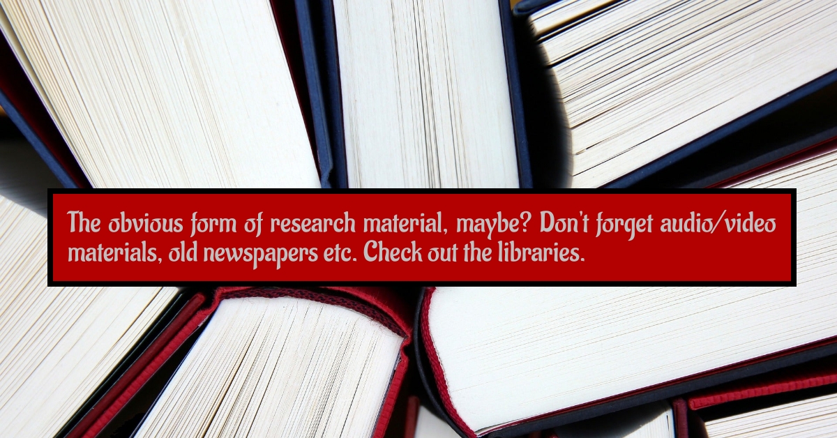 Books may be the obvious form of research material but there are others – audio and video, newspapers etc