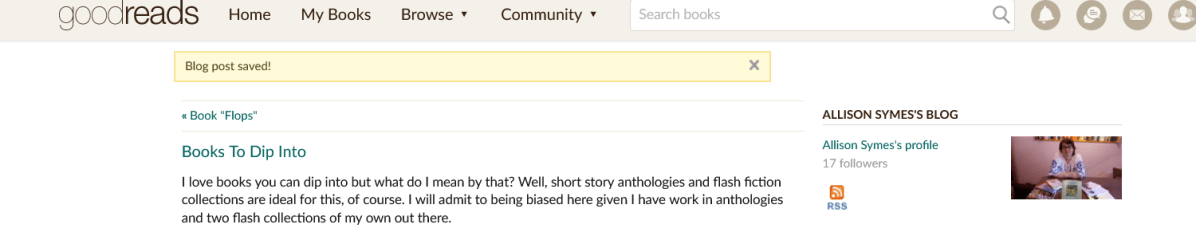 Allison Symes shares her Facebook author page blogs, her website posts and Chandler's Ford Today magazine articles with links. She also blogs about her writing journey and shares thoughts and hints on flash fiction.