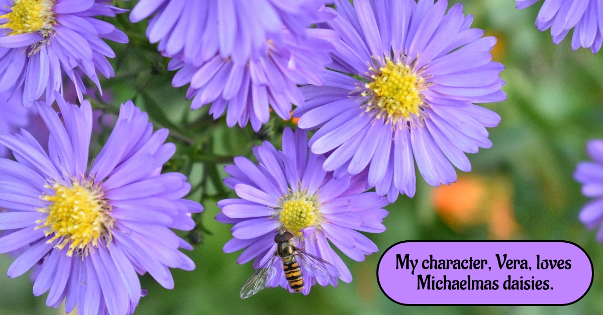 My character Vera loves Michaelmas Daisies Previous Next Published August 25, 2023 at 1200 × 628 in Writing Exercises