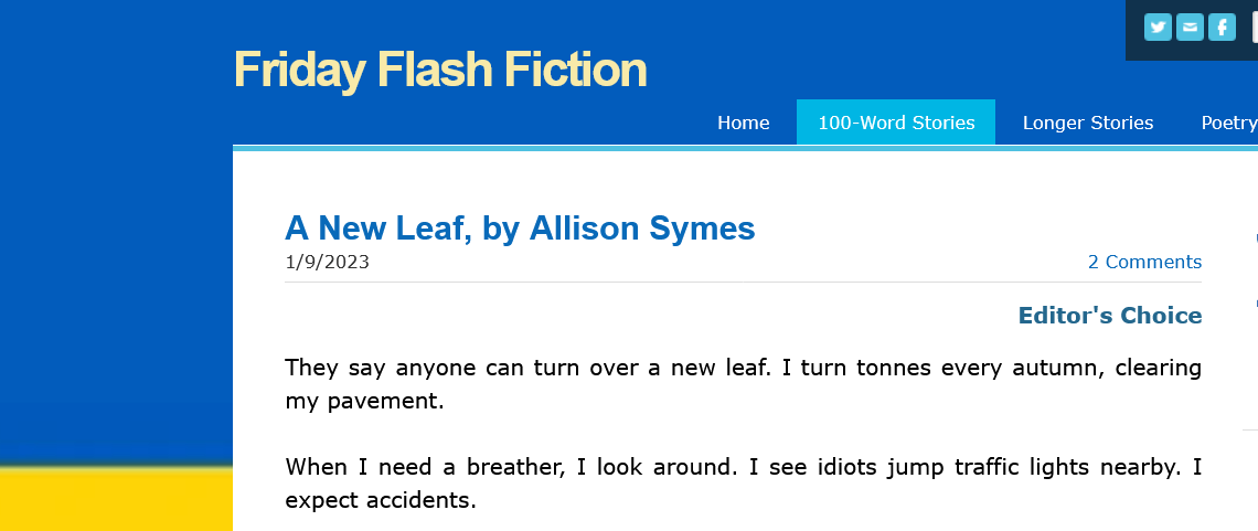 Allison Symes shares her Facebook author page blogs, her website posts and Chandler's Ford Today magazine articles with links. She also blogs about her writing journey and shares thoughts and hints on flash fiction.