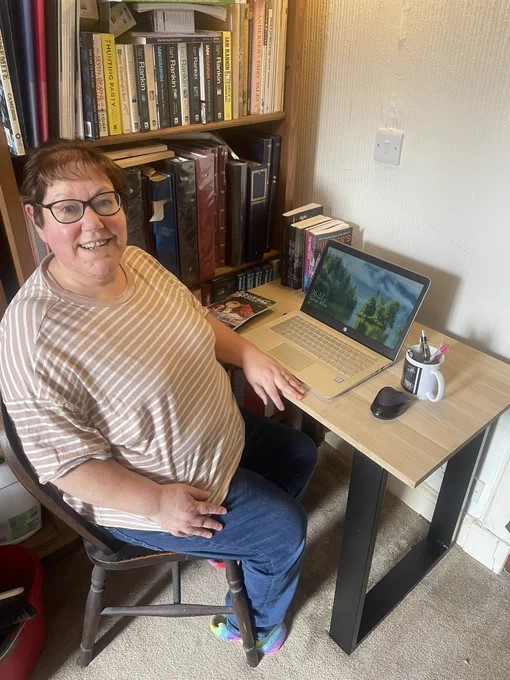 Val at Desk Previous Next Published October 13, 2023 at 510 × 680 in Author Interview: Val Penny – Hunter’s Secret, Writing a Series, and Blog Tours
