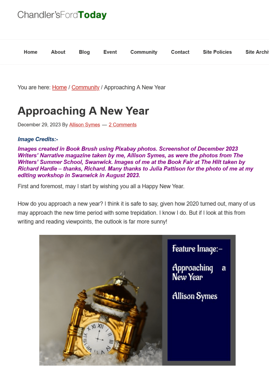 Allison Symes shares her Facebook author page blogs, her website posts and Chandler's Ford Today magazine articles with links. She also blogs about her writing journey and shares thoughts and hints on flash fiction.