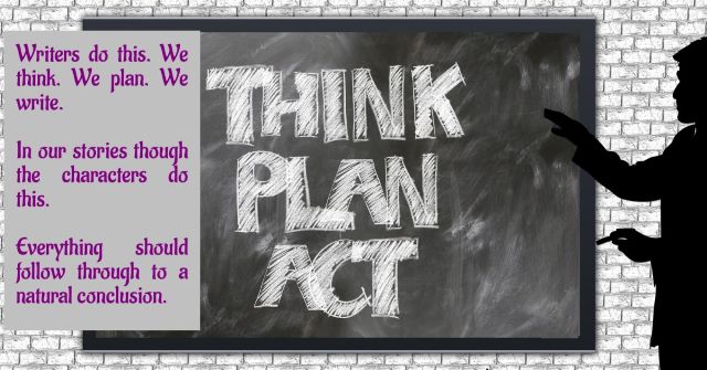 Think, plan, act – characters have to do this too so forward thinking here on the part of the writer pays off