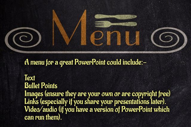 A good PowerPoint menu would include text, bullet points, images and other materials where possible to run them