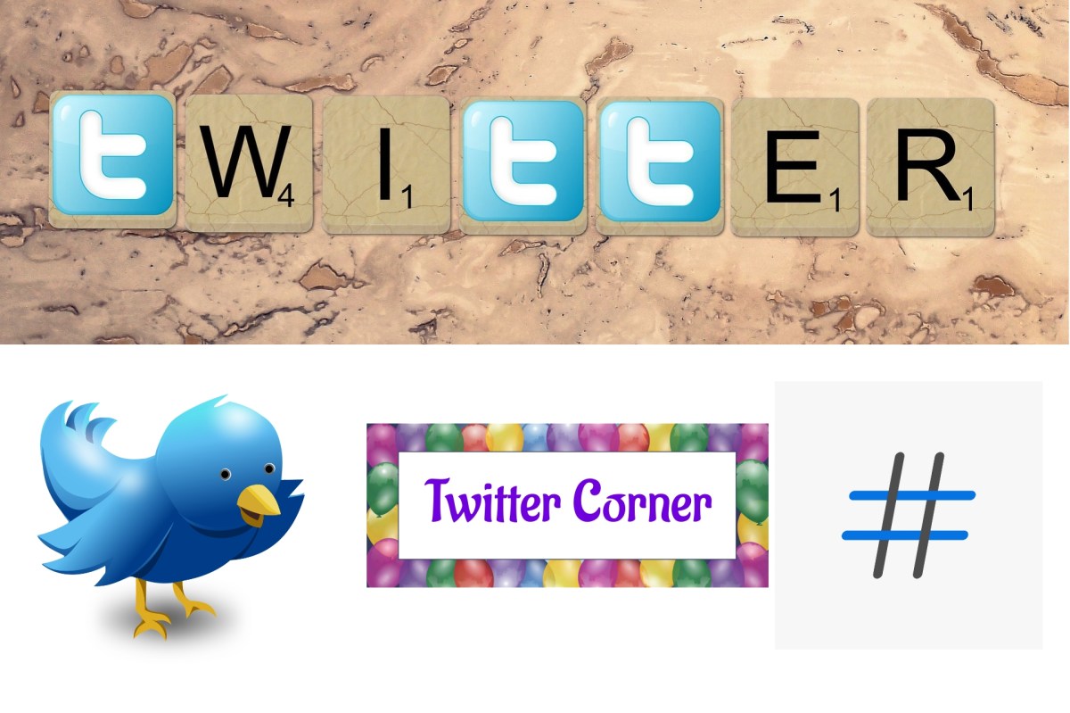 Twitter Corner with hashtag, Scrabble tiles, and the blue bird