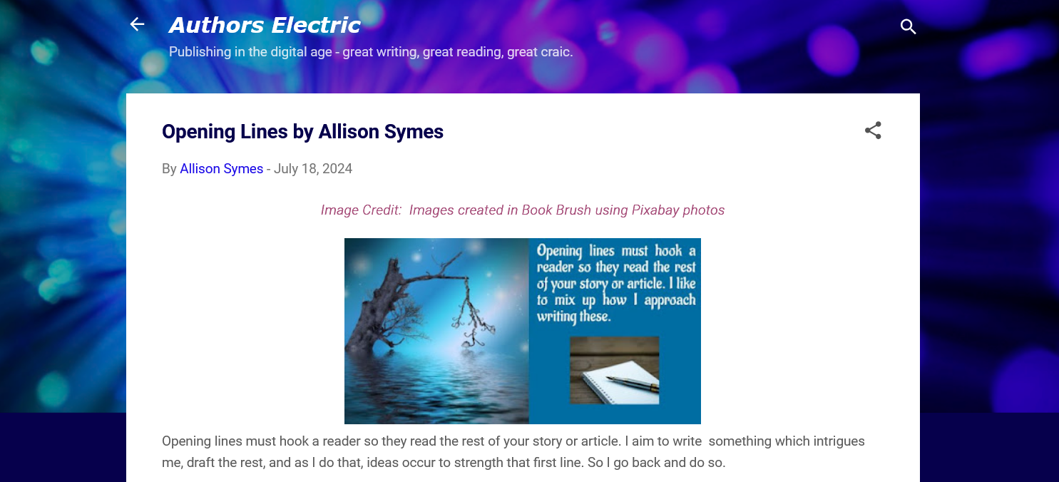 Allison Symes shares her Facebook author page blogs, her website posts and Chandler's Ford Today magazine articles with links. She also blogs about her writing journey and shares thoughts and hints on flash fiction.