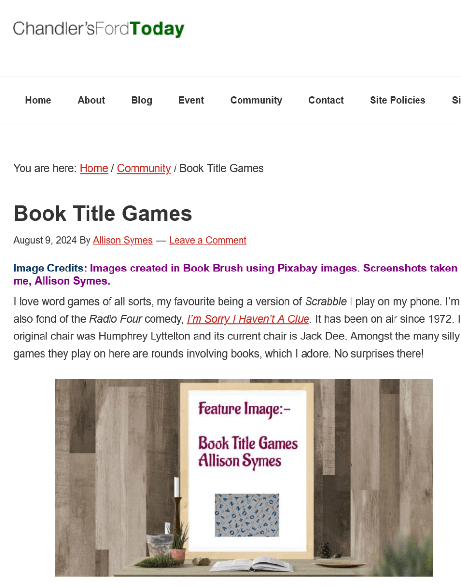 Allison Symes shares her Facebook author page blogs, her website posts and Chandler's Ford Today magazine articles with links. She also blogs about her writing journey and shares thoughts and hints on flash fiction.