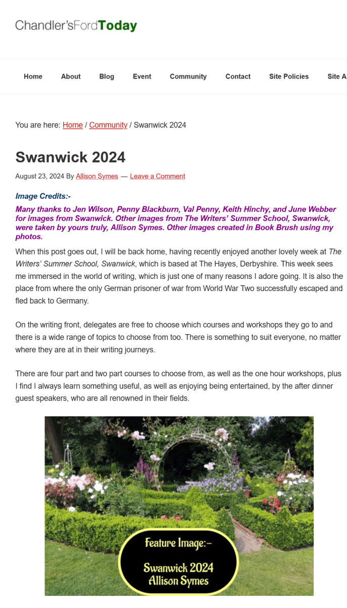 Allison Symes shares her Facebook author page blogs, her website posts and Chandler's Ford Today magazine articles with links. She also blogs about her writing journey and shares thoughts and hints on flash fiction.
