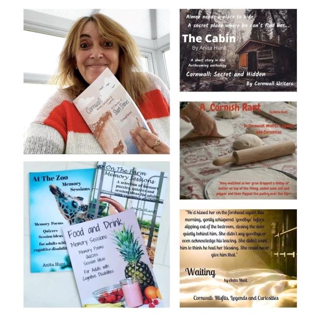 Anita D Hunt with her memory work books and anthologies to which she has contributed for Cornwall Writers