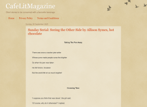I’m delighted to share the latest – and the last – installment of Seeing The Other Side, which is being serialised on CafeLit. I hope you’ve enjoyed the stories serlalised here. Plenty more to come when the book comes out next May. This will be my my biggest flash fiction collection to date and I am so looking forward to seeing it out there. Meantime, do enjoy the last crop of stories for now.