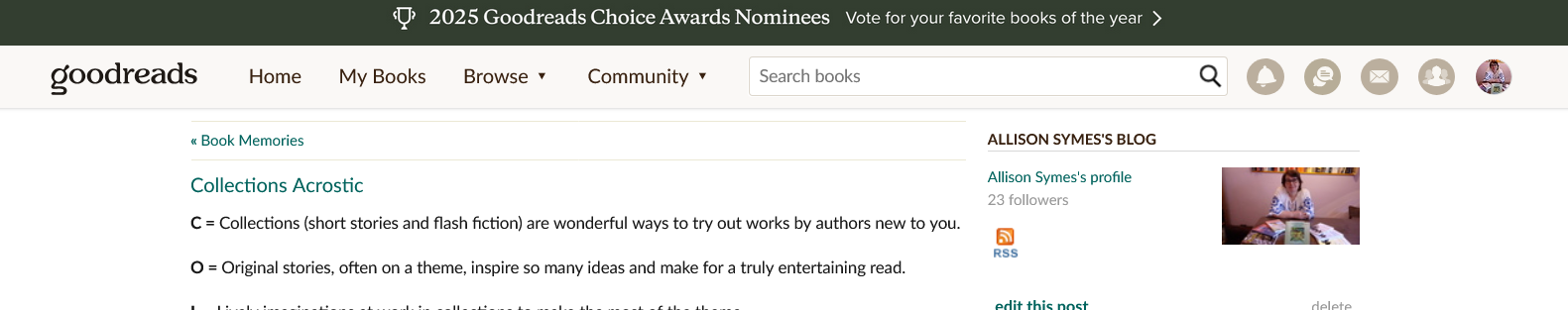 Screenshot 2025-11-15 at 17-47-47 Allison Symes’s Blog – Collections Acrostic – November 15 2025 09 47 Goodreads