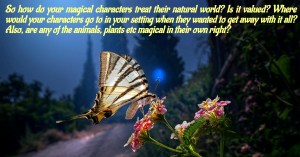 So how do your characters treat their natural world? Is it valued? Would your magical characters appreciate their natural world for its beauty, health benefits to walking in it etc? Where would your characters go to in your setting when they wanted to get away with it all?