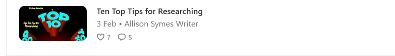 Allison Symes shares her Facebook author page blogs, her website posts and Chandler's Ford Today magazine articles with links. She also blogs about her writing journey and shares thoughts and hints on flash fiction.