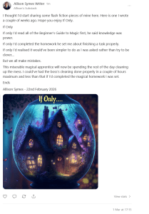 Writing wise, I posted my first flash fiction to my Substack yesterday and I plan to do this regularly. To subscribe to my Substack, just head over to Substack.com/@allisonsymeswriter1