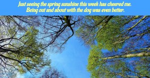 Hope you have had a good few days. Wonderful sunshine here – have even got my washing out, whoopee! Lady and I have loved being out in the nicer weather with pals. It does lift the spirits. Writing continues to go well. Am waiting to hear later this month about whether a flash piece of mine has been accepted but I hope to get on with some more competition entries soon.
