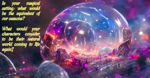 In your magical setting, what would be the equivalent of our seasons? What would your characters consider to be their natural world coming to life again? What would they welcome seeing coming back? What would they dread? For example, if there is a quiet season when the dragons aren’t around, I doubt if your characters, unless they are other dragons, are particularly going to welcome their return!