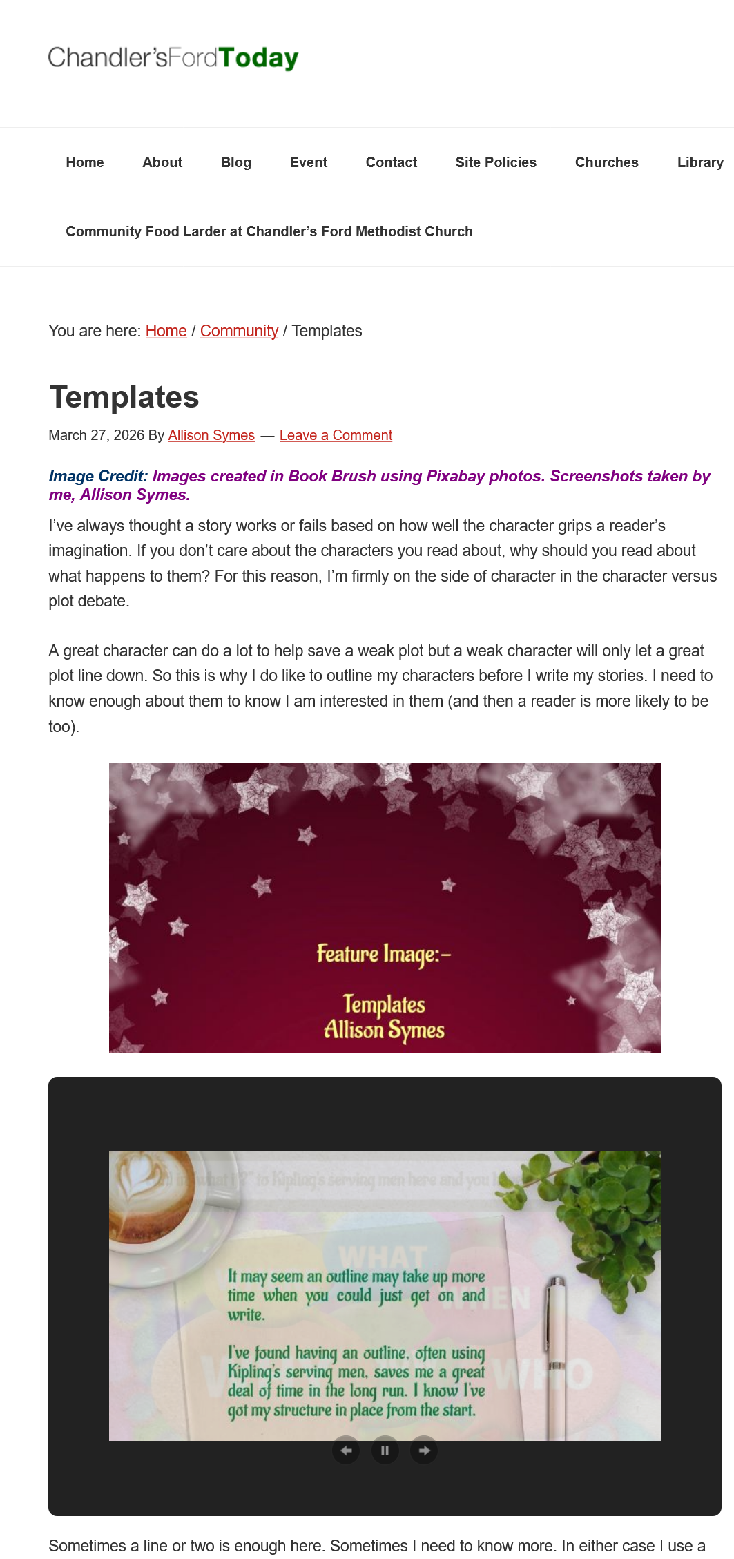 Am pleased to share Templates on Chandler’s Ford Today. I share thoughts on what you could put in your own template to help you flesh out characters and/or settings. All of the questions I share here will help you come up with story ideas.