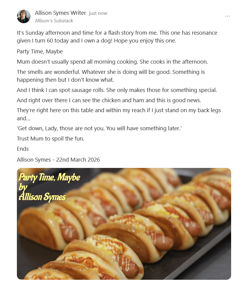Screenshot 2026-03-22 at 17-19-43 Allison Symes Writer (@allisonsymeswriter1) It’s Sunday afternoon and time for a flash story from me. This one has resonance given I turn 60 today and I own a dog! Hope you enjoy this one. […]