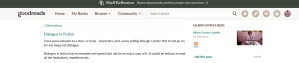 I love every element to a story or book – characters, plot, scene setting (though I prefer that to not go on for too long) and dialogue. Dialogue in fiction has to resemble real speech but not be an exact copy of it. It would be tedious to read all the hesitations, repetitions etc. But fictional dialogue, when it is done well, will propel the story forward, show you more about the characters speaking, and fill in the gaps in back story where a character needs to know something from the past but doesn’t need to know chapter and verse about it.