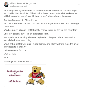 It’s Monday and another hectic one so time to relax with a flash story. Hope you like my latest on YouTube – The Toy Cupboard in the Sky. This one links to The Next Repair Job which I’ve shared via my Substack and via my other Facebook page.