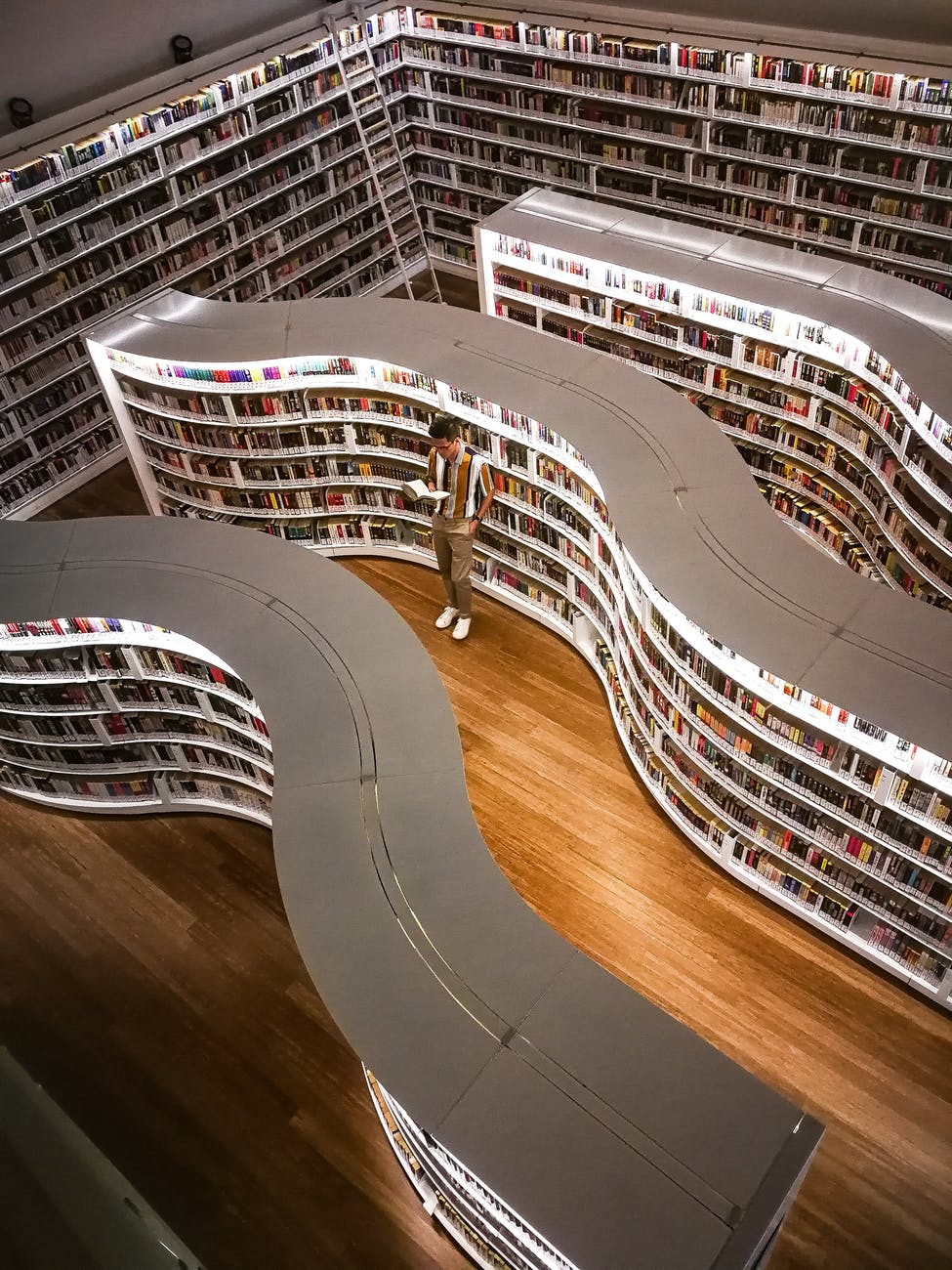 man standing inside library while reading book Published March 17, 2020 at 975 × 1300 Photo by Mark Cruzat on Pexels.com