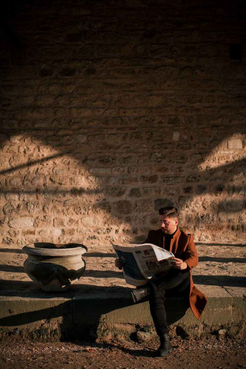 man sitting on sidewalk while reading a newspaper Published March 24, 2020 at 867 × 1300 Photo by Faruk Tokluou011flu on Pexels.com