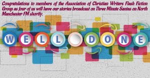 Broadcast News: Am enjoying listening to Three Minute Santas on North Manchester FM as I post this. (Well, I was at the time, honest!). The show is hosted by Hannah Kate (as part of her Hannah’s Bookshelf programme) and I know I am going to love listening to the festive stories. There will be some from members of the Association of Christian Writers Flash Fiction Group, including me, too.